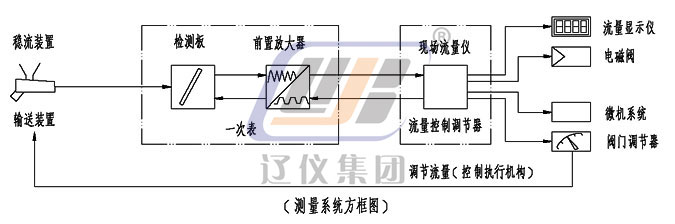 本儀表由(一次表)粉體沖量式流量變送器;(二次表)粉體沖量式流量儀;穩流裝置(一般情況下,由生產廠指導用戶設計、制造)三部分組成(需流量調解時應配流量調節器),系統配套見下圖