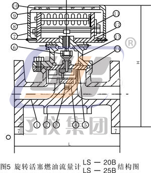 圖5旋轉活塞燃油流量計LS-13B結構圖 1 計量室蓋 2 槽輪 3 定心軸 4活塞 5主體 6 外磁鋼 7 表頭罩 8 記數輪 9表盤 10 面罩 11 表頭體 12調差齒輪 13上蓋 14減速機構 15 O型密封圈 |